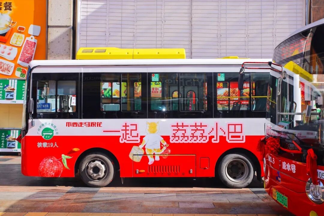 車(chē)身以“荔枝紅”和米白色為主色調(diào),印有“不要走馬觀花,一起荔荔小巴”字樣,可愛(ài)靈動(dòng)的手繪小貓?jiān)厥謸屟邸?/p>