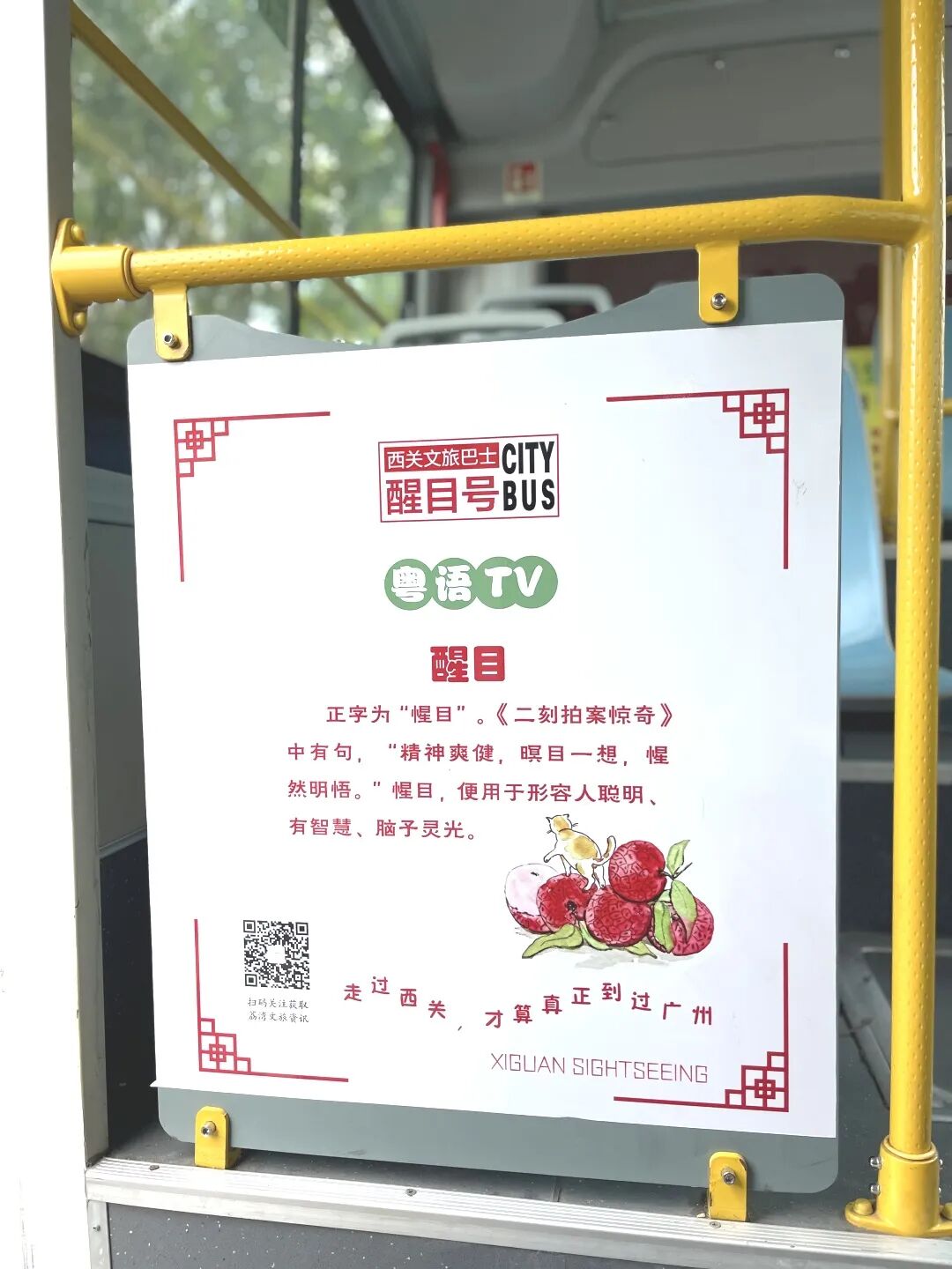 6臺(tái)“荔荔小巴”包括“醒目號(hào)”“有米號(hào)”“威水號(hào)”“叻叻號(hào)”“飲勝號(hào)”“架勢(shì)號(hào)”,除了車(chē)身各有不同外,每臺(tái)車(chē)?yán)锒疾赜胁灰粯拥摹盎浾Z(yǔ)TV”和“西關(guān)冷知識(shí)”,還設(shè)有荔灣文旅資料架,供市民游客免費(fèi)取閱文旅地圖、宣傳小冊(cè)子等,帶你游遍西關(guān)外,還能學(xué)習(xí)粵語(yǔ)、了解西關(guān)、讀懂荔灣。